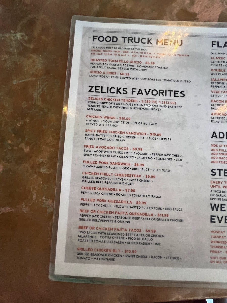 Many guests enjoy Zelicks for evening outings or casual gatherings, especially on nights like the popular Tuesday steak special. Whether you’re unwinding after the day with a cold michelada or sharing a basket of fries alongside a signature burger, the menu complements the warm, inviting space where friends can relax without fuss.