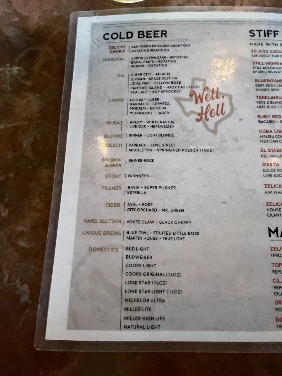 Zelicks Icehouse Menu